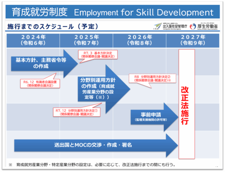 新制度は 2027年6月までの施行がすでに決定しています。施行後は新規での技能実習生の受け入れはできなくなりますが、すでに受け入れている技能実習生は、引き続き認定計画に沿って実習を行うことができます。