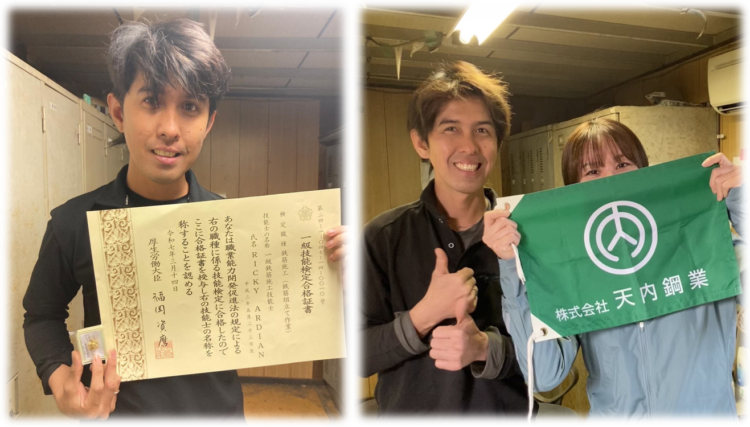 Selamat atas kelulusanmu dalam Ujian Keterampilan Besi Beton Tingkat 1. Saya membayangkan bahwa mengikuti ujian nasional Jepang merupakan tantangan yang cukup besar bagi Riki, seorang warga negara Indonesia. Kamu benar-benar telah berusaha keras. Saya berharap dapat melihat kesuksesanmu selanjutnya.