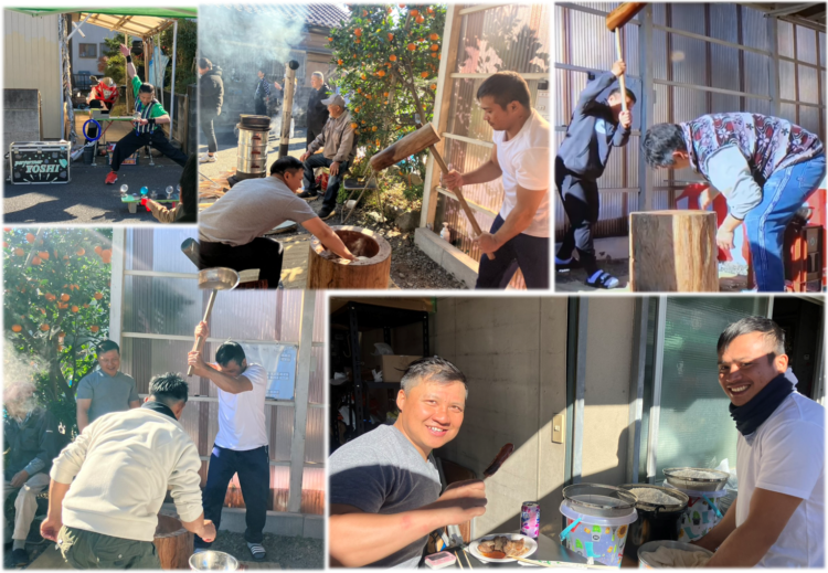 今回も年末恒例の餅つき大会におじゃまさせていただきました。今年も4人の実習生が力強く餅をつき、ご近所の方々や従業員のご家族、取引先の皆様をお招きして賑やかな一日となりました